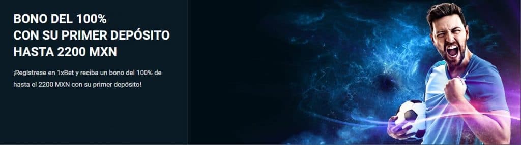Podrás obtener hasta un abono de 100% hasta los $2.200 MXN en el primer depósito que hagas. Es decir, cuando realices el primer pago de $1.000 pesos, recibiras la misma cantidad como bono. Lo único que debes hacer para conseguirlo es introducir el Código Promocional 1xbet y registrarte en la plataforma. Cuando lo hayas hecho, tienes que hacer el primer depósito para, seguidamente, recibir el bono. Eso sí, debes tener muy en cuenta que la cantidad máxima que puedes recibir son $2.200 MXN. Es decir, si haces un depósito de $2.500MXN, vas a recibir $2.200 MXN de bono, ya que es el máximo total que puedes recibir.